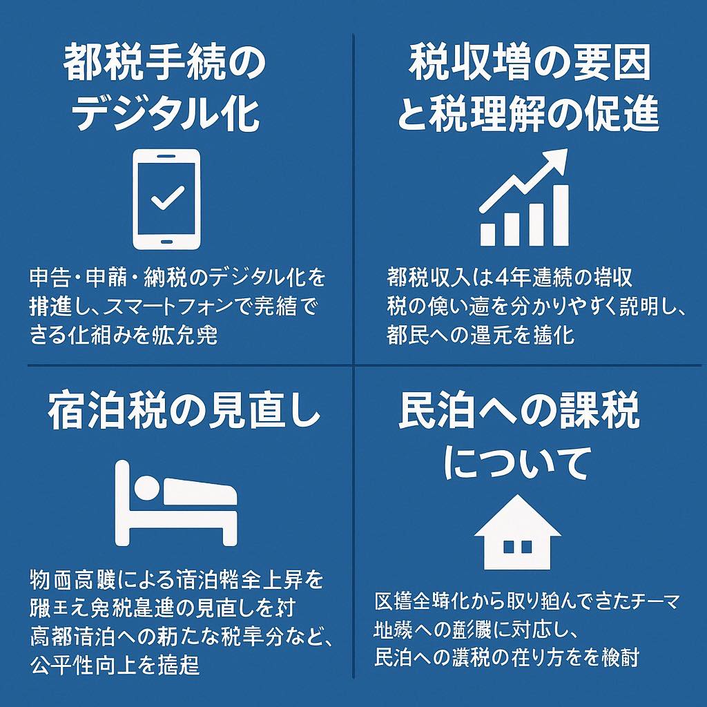 特に「デジタル化」「税収増の背景」「宿泊税の見直し」「民泊課税のあり方」の4つを中心に、現場の声と都民目線を踏まえた問題提起を行いました。