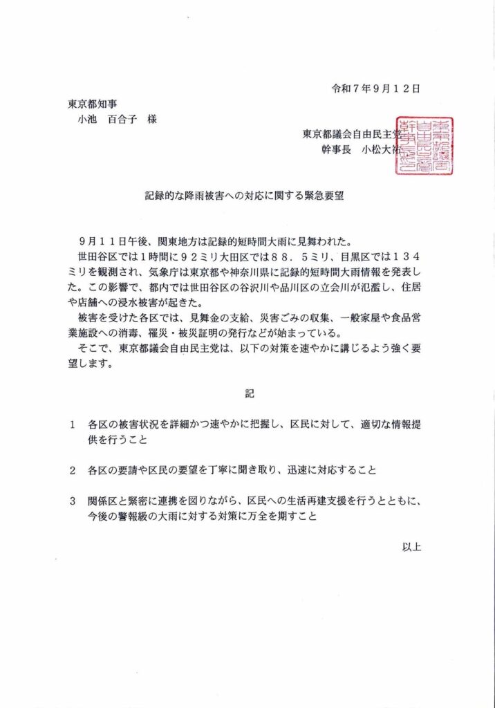 本日、小池都知事に対し緊急要望を提出しました。